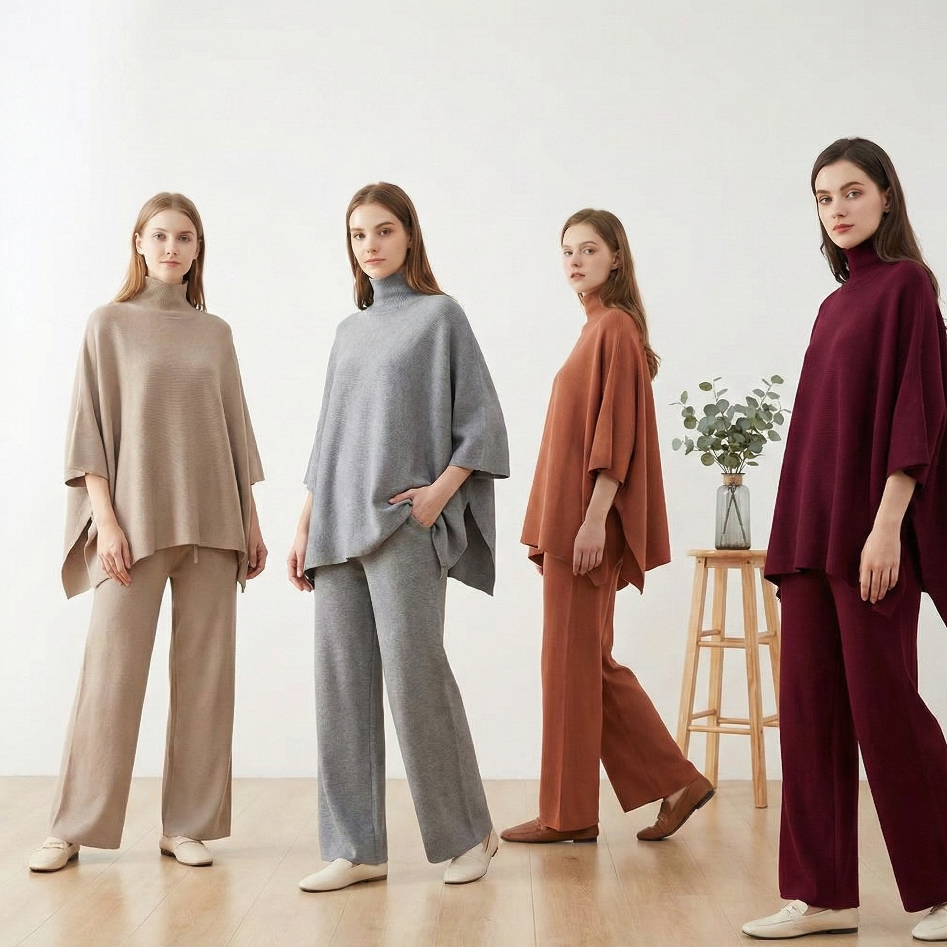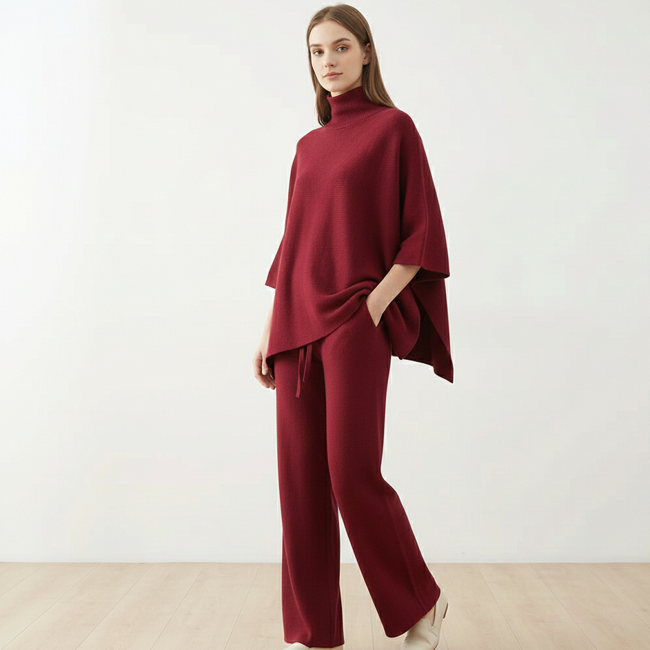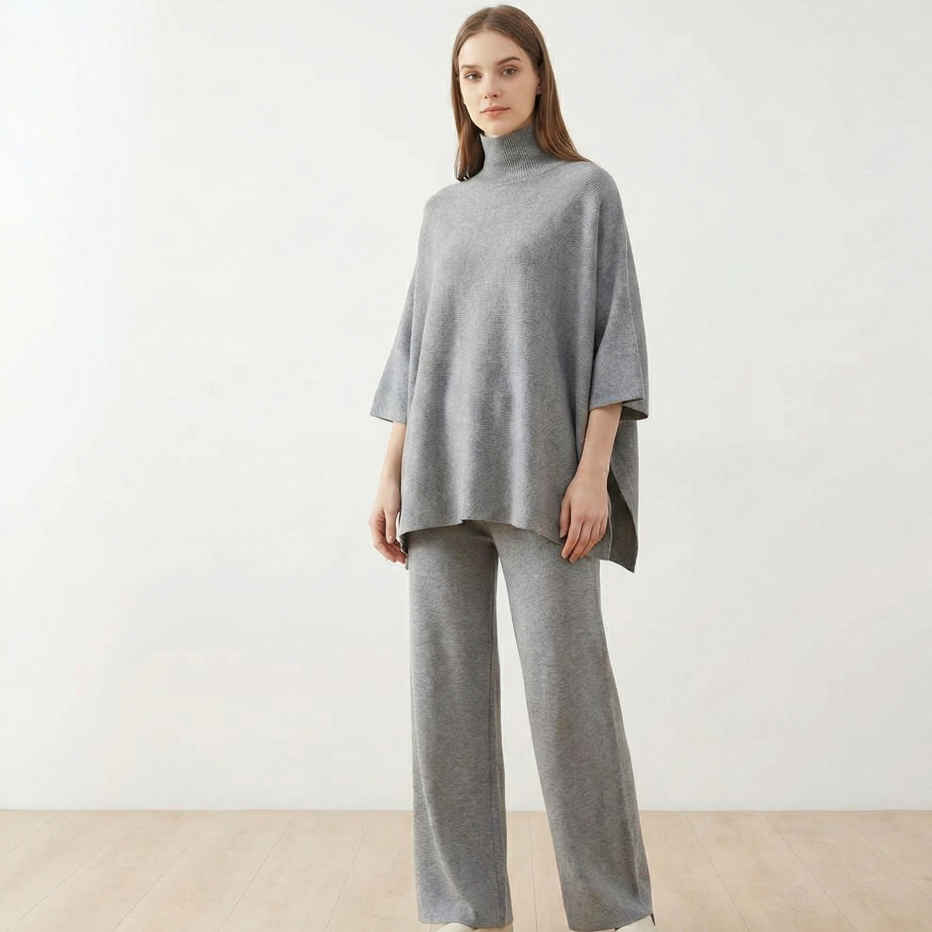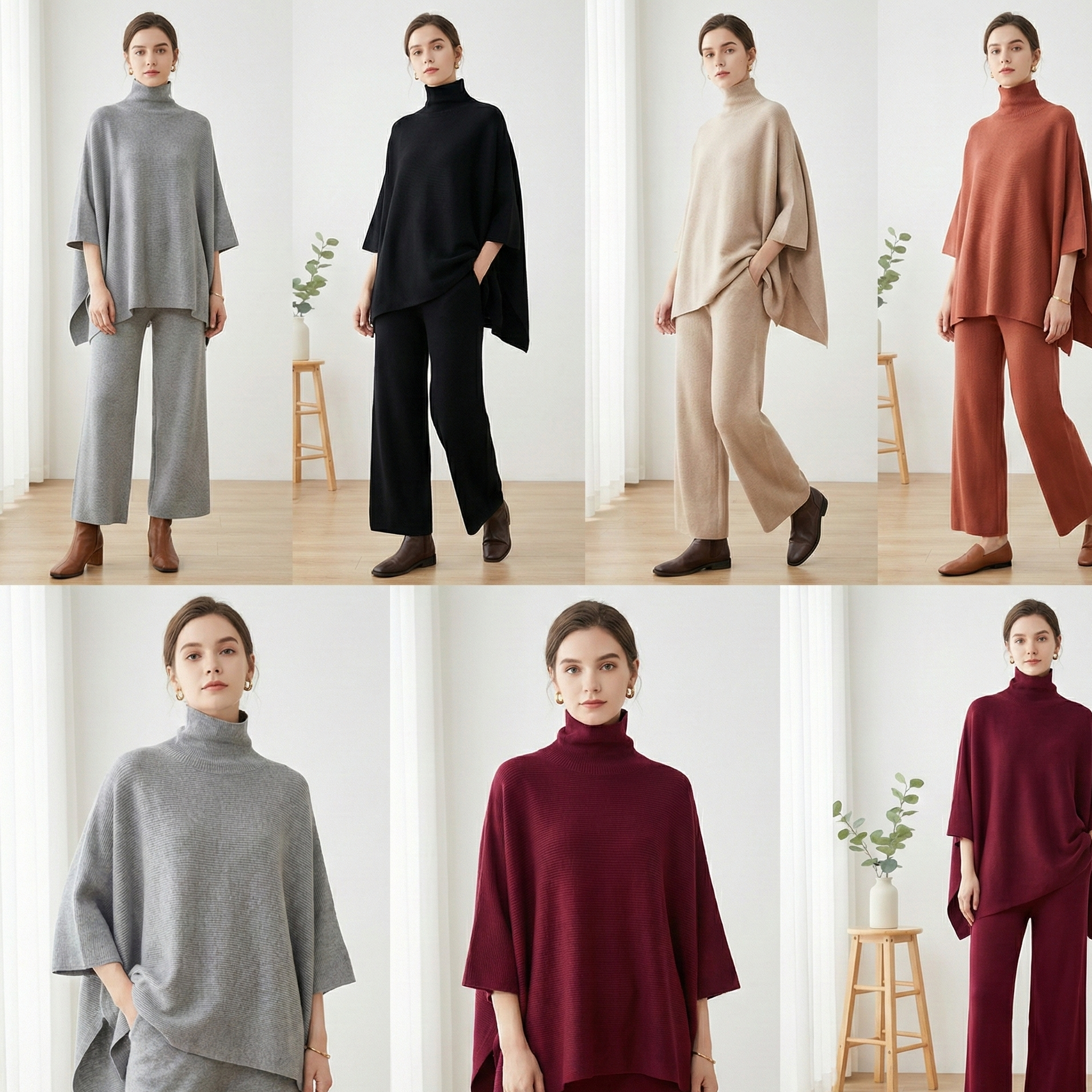 È il completo che ti salva la mattina. Insieme è un total look elegante e monocromatico che allunga la figura. Spezzato è utilissimo: il poncho sta bene sui jeans, i pantaloni risolvono qualsiasi maglione basico. Minimo sforzo, massimo risultato.